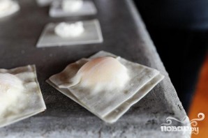6. Чтобы сделать равиоли с яичным желтком, выложить желток в центр обертки, накрыть сверху второй оберткой и закрепить края, как указано выше.