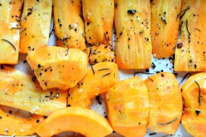 Тыкву очистите и крупно нарежьте. Разложите ломтики в жаропрочной форме, посыпьте крупной морской солью, смесью перцев и розмарином. Добавьте чеснок, раздавленный в шелухе и сбрызните все оливковым маслом. Запекайте в разогретой до 180 градусов духовке до мягкости и легкой румяности.