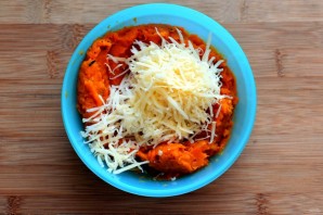 Запеченную тыкву разомните вилкой в пюре, запеченный чеснок очистите от шелухи и тоже растолките. Натрите половину пармезана на мелкой терке и смешайте с тыквой.