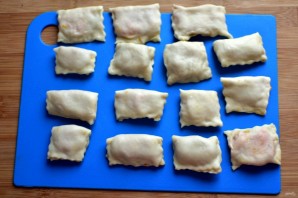 Раскатайте тесто не слишком тонко, нарежьте его на прямоугольные кусочки и слепите равиоли среднего размера.