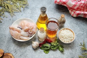 Щупальцу осьминога сполосните, залейте 1.5 литрами воды и поставьте на средний огонь. Доведите воду до кипения, убавьте огонь, закройте крышкой и варите в течение 60-70 минут, до готовности. Если мясо легко протыкается ножом, осьминог готов. Снимите кастрюлю с огня, осьминога достаньте и остудите, бульон оставьте, он нам еще понадобится.