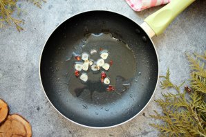 В кастрюлю с толстым дном налейте растительное масло и разогрейте на среднем огне. Добавьте в сковороду порезанный чеснок и острый перец. Обжаривайте все в течение 30 секунд.