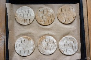 Все заготовки лепешек выложите на противень, застеленный пищевым пергаментом, каждую лепешку наколите вилкой. Выпекайте ржаные лепешки в уже разогретой заранее духовке до 200 градусов в течение 15 минут.