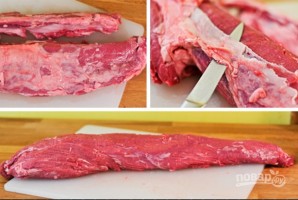 Прежде всего вымойте мясо и хорошо обсушите. Острым ножом срежьте мышечные ткани, если они есть на кусочке, и жировые прожилки.