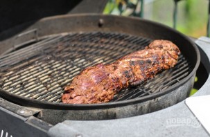 Если готовите на огне, то жарить мясо будем на той части гриля, где будет средняя температура, то есть не посредине, где самый жар, а чуть сбоку. Кладем мясо на гриль и жарим 15-20 минут, перевернув один раз.