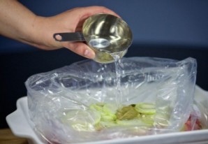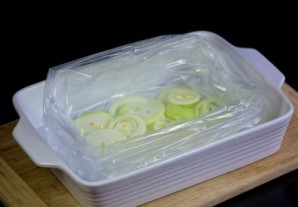 В форму уложите рукав для запекания и половину нарезанного лука.