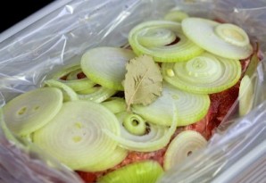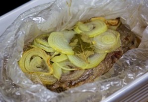 Уложить лук на мясо.