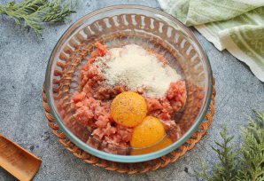 Репчатый лук мелко порежьте, морковь натрите на мелкой терке и обжаривайте на растительном масле в течение 6 минут, перемешивая, остудите. Выложите овощи в фарш, перемешайте.
