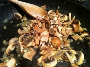1. Грибочки вымойте, обсушите и нарежьте средними кусочками. Очистите и измельчите лук с чесноком. Разогрейте на сковороде растительное масло. Выложите лук с чесноком, обжарьте до прозрачности и добавьте грибы.