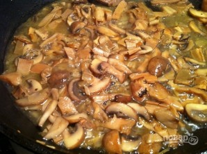 2. На среднем огне жарьте, периодически помешивая, пока не выйдет вся лишняя жидкость. Также можно добавить немного сушеных грибов, предварительно размочив их. Тогда у соуса будет более насыщенный грибной аромат.