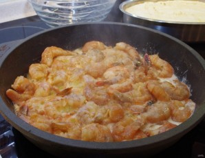 5. Соусом заливаем ранее приготовленные креветки и тушим еще 10 минут. При желании можно добавить зелень укропа.