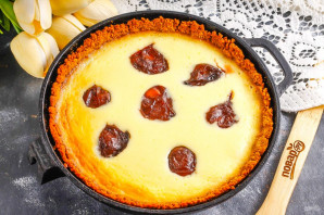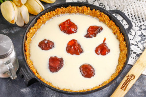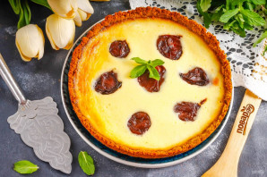 Аккуратно извлеките форму из духовки и влейте в нее творожную начинку. Выложите консервированные или свежие промытые сливы без косточек. Отправьте форму в духовку на 40-50 минут.