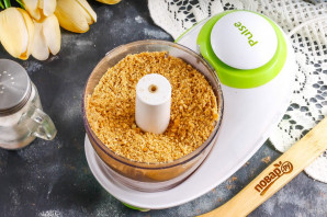 Песочное или постное печенье измельчите в руках, затем пересыпьте в чашу блендера или измельчителя. Пробейте в крошку примерно 2-3 минуты, чтобы не было слишком крупных комочков.