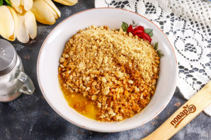 В отдельной емкости растопите сливочное масло и всыпьте в емкость крошку печенья. Перемешайте.