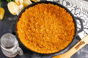 Выложите всю массу в форму и разровняйте, заходя и на бортики. Разогрейте духовку до 180 градусов и поместите форму в нее на 10 минут. Диаметр моей формы 24 см.