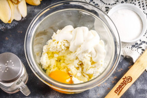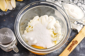 Пока основа выпекается, выложите творог любой жирности в глубокую емкость, туда же добавьте сметану, вбейте куриное яйцо.