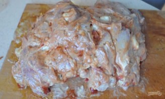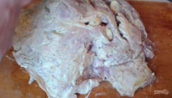 3. Посолите и поперчите мясо, смажьте его ровным слоем горчицы со всех сторон. Далее смажьте мясо майонезом, потом — соусом "Сацебели". В конце смажьте аджикой или присыпьте приправой для мяса.