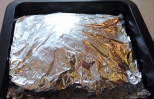 4. Заверните мясо в фольгу в форме конверта, хорошо закрепив края вверх, чтобы сок при выпекании не выливался в поддон. Поставьте мясо в холодильник минимум на 6 часов.