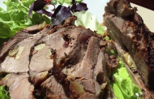 2. Возьмите мясо, сделайте на нем надрезы глубиной приблизительно 1 сантиметр, залейте в них масло с солью и перцем, закройте их зубчиком чеснока. Сделайте такие надрезы по всему мясу с обеих сторон.