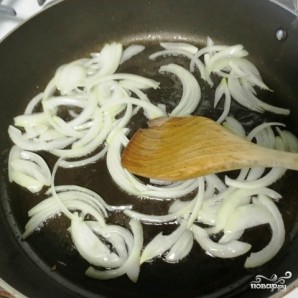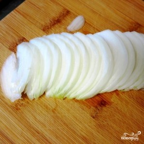 Сперва тонкими полукольцами нарежем лук.