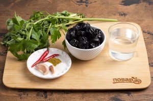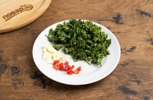 Острый перец очистите от семян и порежьте кружочками. Чеснок очистите от шелухи и порежьте пластинами. Петрушку и базилик помойте, обсушите и мелко порежьте.