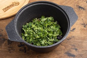 Затем добавьте мелко порезанную зелень, еще раз перемешайте и готовьте 10 минут.