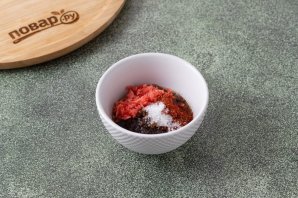 Перелейте соус в отдельную емкость. Добавьте измельченный маринованный имбирь, сахар и красный молотый перец. Все перемешайте.