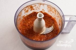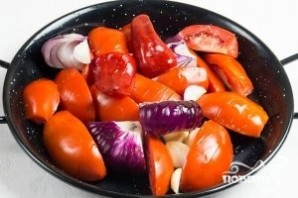 3. Вынимаем форму из духовки, ждем до остывания овощей. Очищаем помидоры от кожуры. Овощи перекладываем в блендер и измельчаем, чтобы чувствовались крупные кусочки.