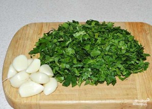 Промойте петрушку, обсушите ее. Затем мелко нарежьте. Чеснок почистите и измельчите.