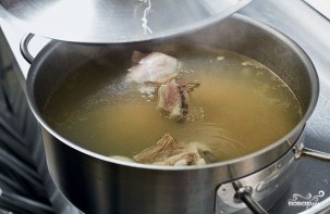 1. В глубокой кастрюле залейте холодной водой половину мяса, очищенный лук. Туда же добавьте нут, заранее замоченный в холодной воде на 7-10 часов. После закипания уберите огонь и варите около часа. Готовый бульон необходимо процедить, чтобы супчик был прозрачным.