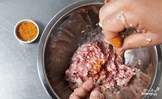 2. Остальное мясо вымойте, обсушите немного и пропустите через мясорубку вместе луком. Перемешайте фарш, посолите и поперчите по вкусу, добавьте куркуму. Отварите минуты 2 рис в подсоленной воде и добавьте в фарш. Все как следует перемешайте и оставьте пока в холодильнике.