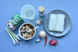 Для приготовления супа подготовьте продукты. Суп можно приготовить на воде или заранее сварить для него куриный или овощной бульон. В качестве белковой составляющей можно взять любимые вами морепродукты свежие, консервированные или замороженные. Если у вас нет отдельно взятых компонентов характерных для тайского супа используйте готовую пасту "Том Ям".