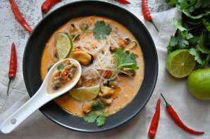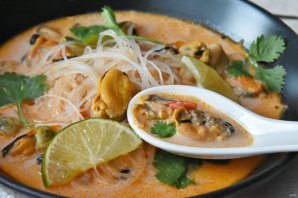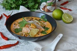 Рецепт не отнимет много времени. Не готовьте суп "Том Ям" впрок. Тайские супы готовятся на раз, так как не подлежат повторному нагреву. Данный суп можно приготовить с любой лапшой. Если у вас есть в наличии рамен, выложите лапшу в кипящий суп и накрыв кастрюлю крышкой, отключите огонь. Через 5 минут лапша дойдет до готовности и суп можно будет подавать к столу Подавайте с зеленью и сметаной.
