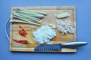 Подготовьте вкусовую основу для супа. Лук, чеснок, чили, имбирь измельчите. Стебель лемонграсса расплющите плоской стороной ножа и разрежьте на сегменты.