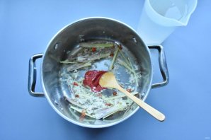 В суповую основу выложите томатную пасту, перемешайте и влейте воду или бульон.