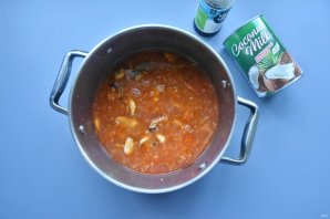 Влейте в суп кокосовое молоко. Отрегулируйте вкус, добавив рыбный соус в качестве соли. Поварите суп 3-4 минуты и снимите с огня.