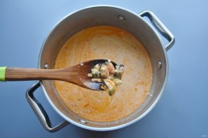 Поварите суп минут 5 чтобы бульн впитал все вкусы и ароматы. На данном этапе можно удалить стебли лемограсса. Они жесткие и не предназначены для еды. Добавьте в суп предварительно размороженные и промытые в холодной воде мидии.