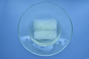 Фунчозу выложите в миску и залете холодной водой. Оставьте лапшу на 5 минут до размягчения.