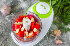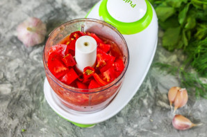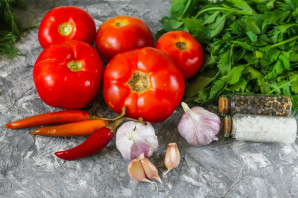Помидоры приобретите спелые, сочные, желательно мясистых сортов, например "Микадо". Промойте их в воде, вырежьте зеленые черенки и нарежьте ломтиками, выложите в чашу измельчителя или кухонного комбайна. Очистите чеснок от шелухи, промойте в воде. Добавьте в емкость.