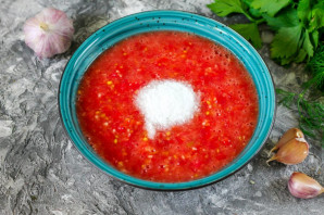 Отпюрируйте все в течение 3-4 минут, используя пульсирующий режим. Можно измельчить все ингредиенты на мясорубке, если кухонного комбайна или измельчителя нет под рукой. Перелейте томатную массу в глубокую емкость и добавьте соль. Тщательно вмешайте ее в массу.