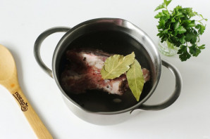 Мясо промойте, залейте водой, добавьте лавровый лист и перец горошком. Варите при слабом кипении до полной готовности.