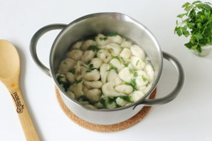 Бульон вновь доведите до кипения, посолите и поперчите по вкусу. При помощи двух чайных ложечек берите тесто и опускайте его в бульон. Учтите, что клецки еще увеличатся в размере, поэтому делайте их не слишком большие. Варите клецки после всплытия около 4-6 минут, в конце добавьте измельченный чеснок и рубленую зелень. Накройте крышкой и дайте настояться. Татарские клецки готовы.