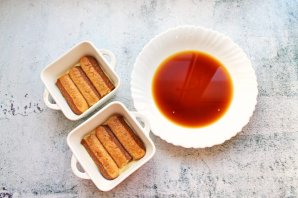 Смешайте крепкий кофе с коньяком. Опустите на 1-2 секунды печенье и выложите на крем одним плотным слоем.