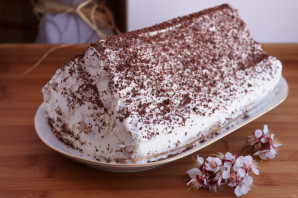 Также сливками обмажьте весь собранный торт со всех сторон. Сверху торт можно украсить тертым шоколадом.
