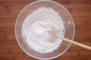 Добавьте соду, погашенную уксусом и немного муки, перемешайте. Добавьте щепотку соли.
