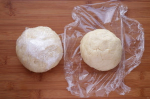 В итоге должно получиться пластичное тесто. Тесто разделите на две равные части, оберните пленкой и отправьте в холодильник на 1 час.