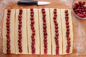 Вишню из компота откиньте на дуршлаг, дайте стечь всей жидкости, затем просушите. Одну часть теста раскатайте в прямоугольник 50х25 см. и толщиной около 4 мм. Подравняйте края теста и разделите полученный пласт по вертикали на 7 полос шириной 6 см. На середину каждой полосы выложите вишни. Тщательно скрепите края, чтобы получились трубочки. Обрезки теста присоедините к оставшейся части теста, затем раскатайте его, подравняйте и разделите уже на 8 полос. Также выложите вишню и слепите края.