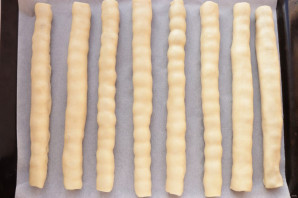 Всего у вас должно получиться 15 трубочек. Трубочки выложите на противень, застеленный пекарской бумагой, на расстоянии друг от друга. Выпекайте в разогретой до 180 градусов духовке в течение 30 минут.