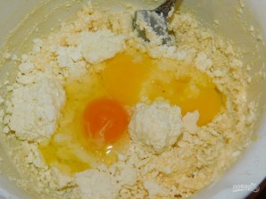 Творог разотрите с сахаром и сметаной. Добавьте яйца.