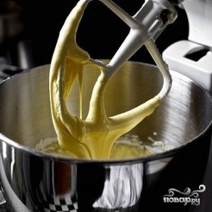 Перво-наперво берем яичные желтки и взбиваем их с сахаром и небольшим количеством сахарной пудры. Затем сюда же добавляем муку, масло и взбитые до плотной пены яичные белки. Взбиваем.